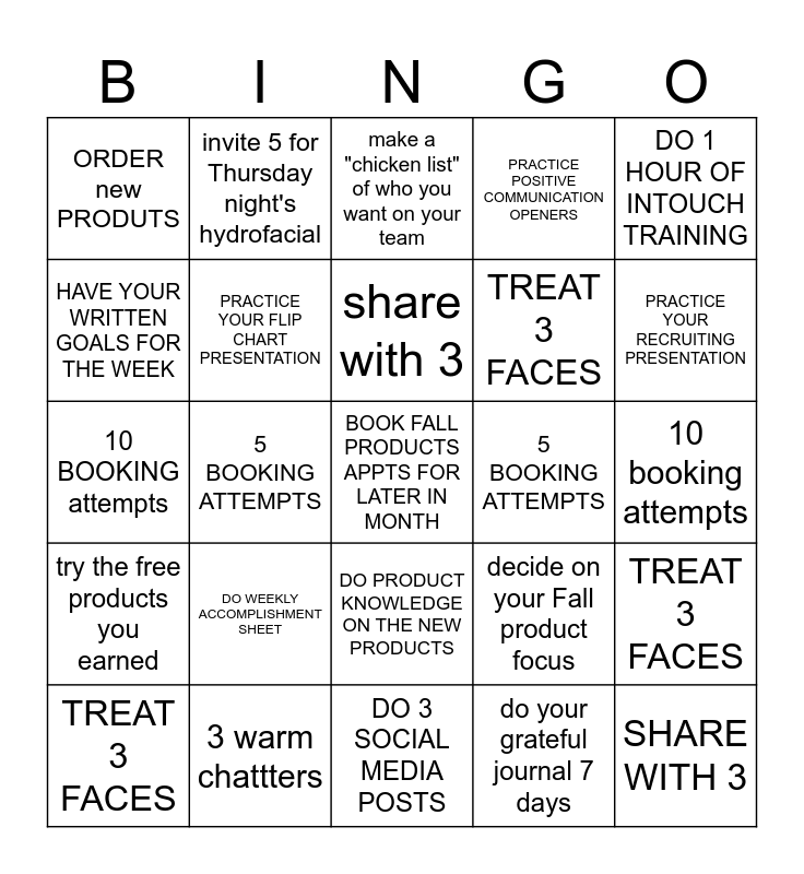 This bingo card has 25 words: DO WEEKLY ACCOMPLISHMENT SHEET, DO 3 SOCIAL MEDIA POSTS, share with 3, TREAT 3 FACES, DO 1 HOUR OF INTOUCH TRAINING, ORDER new PRODUTS, HAVE YOUR WRITTEN GOALS FOR THE WEEK, invite 5 for Thursday night's hydrofacial, 5 BOOKING ATTEMPTS, DO PRODUCT KNOWLEDGE ON THE NEW PRODUCTS, TREAT 3 FACES, 10 BOOKING attempts, decide on your Fall product focus, TREAT 3 FACES, PRACTICE YOUR FLIP CHART PRESENTATION, SHARE WITH 3, 10 booking attempts, make a "chicken list" of who you want on your team, PRACTICE YOUR RECRUITING PRESENTATION, 5 BOOKING ATTEMPTS, BOOK FALL PRODUCTS APPTS FOR LATER IN MONTH, 3 warm chattters, try the free products you earned, PRACTICE POSITIVE COMMUNICATION OPENERS and do your grateful journal 7 days.