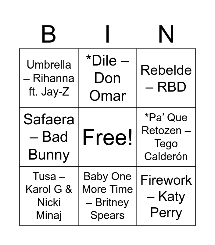 This bingo card has a free space and 50 words: Gasolina – Daddy Yankee, Ella Me Levantó – Daddy Yankee, Lo Que Pasó, Pasó – Daddy Yankee, *Rakata – Wisin & Yandel, Sexy Movimiento – Wisin & Yandel, *Mayor Que Yo – Wisin & Yandel, Daddy Yankee, Baby Rasta & Gringo, *Dile – Don Omar, Pobre Diabla – Don Omar, *Pa’ Que Retozen – Tego Calderón, Noche de Sexo – Wisin & Yandel ft. Aventura, Tusa – Karol G & Nicki Minaj, Safaera – Bad Bunny, Tití Me Preguntó – Bad Bunny, Bichota – Karol G, Todo de Ti – Rauw Alejandro, Oops!… I Did It Again – Britney Spears, Baby One More Time – Britney Spears, Poker Face – Lady Gaga, Bad Romance – Lady Gaga, Firework – Katy Perry, Teenage Dream – Katy Perry, Don’t Stop the Music – Rihanna, Umbrella – Rihanna ft. Jay-Z, I Gotta Feeling – Black Eyed Peas, Tik Tok – Kesha, Hips Don’t Lie – Shakira, Waka Waka – Shakira, La Tortura – Shakira ft. Alejandro Sanz, Rebelde – RBD, Sálvame – RBD, Rosa Pastel – Belanova, Eres – Café Tacuba, Mi Primer Millón – Bacilos, La Camisa Negra – Juanes, Limón y Sal – Julieta Venegas, Danza Kuduro – Don Omar ft. Lucenzo, On the Floor – Jennifer Lopez ft. Pitbull, Let’s Get Loud – Jennifer Lopez, Don’t Stop Believin’ – Journey, Livin’ la Vida Loca – Ricky Martin, Bailando – Enrique Iglesias, La Vida es un Carnaval – Celia Cruz, El Rey – Vicente Fernández, La Incondicional – Luis Miguel, Querida – Juan Gabriel, Dancing Queen – ABBA, Barbie Girl – Aqua, Dynamite – Taio Cruz, Mr. Brightside – The Killers and YMCA – Village People.