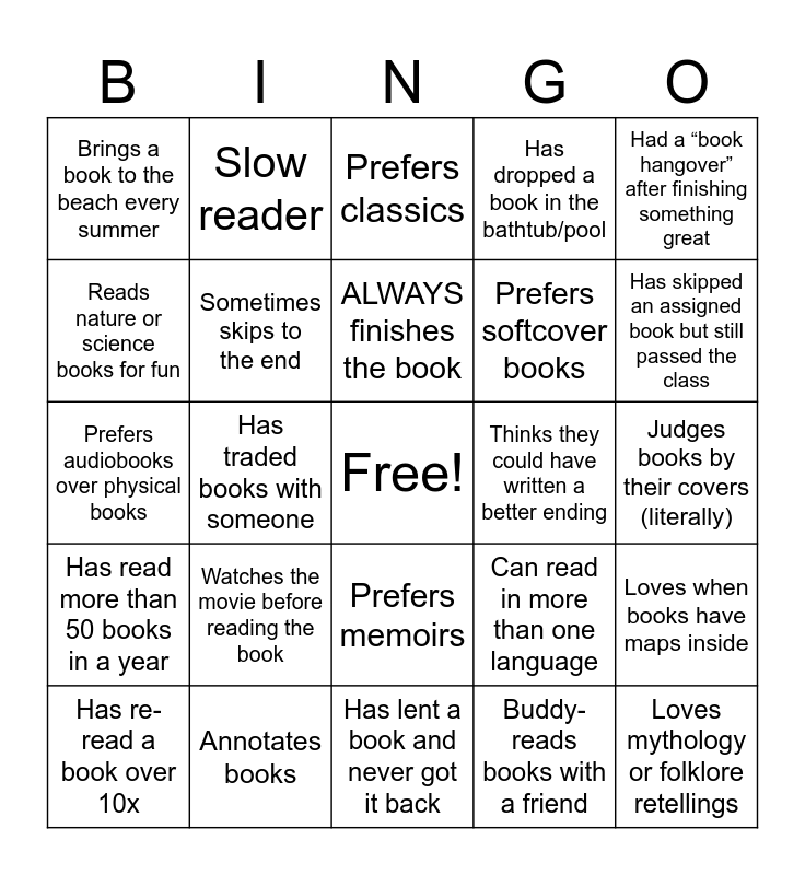 This bingo card has a free space and 94 words: Future writer, Has attended STF before, Has lent a book and never got it back, Can name one famous book quote, "Book-tok" regular, Read a book in 1 day, Owns more than 50 books, Has re-read a book over 10x, Reads every night, Prefers short stories over novels, Owns an active library card, Has cried reading a book, Has a book in their bag, Prefers softcover books, Loves sci-fi books, Had a “book hangover” after finishing something great, Prefers classics, Uses random bookmarks, Has a TBR longer than 20 books, Remembers their favorite childhood book, Romance fan, Has stayed up all night to finish a book, Reads fanfic, Has a library card, Watches the movie before reading the book, Sometimes skips to the end, Just read the cliffnotes, Chronic tote collector, Reads poetry, Read a 700+ page book, Annotates books, Prefers memoirs, E-book advocate, Has a Goodreads, Slow reader, Has fallen asleep reading, Prefers manga, Can name 3 banned books, ALWAYS finishes the book, Can read in more than one language, Prefers audiobooks over physical books, Has read more than 50 books in a year, Judges books by their covers (literally), Is currently reading more than one book at a time, Loves mythology or folklore retellings, Enjoys historical fiction, Collects special editions, Loves giving books as gifts, Has dressed up as a book character, Has been scared by a book, Has laughed out loud while reading, Buddy-reads books with a friend, Goes to author signings, Reads in bed most of the time, Reads while traveling, Has a favorite author, Reads mostly for fun, Has watched a movie or show based on a book, Has a least favorite book, Has gotten a book as a gift, Has traded books with someone, Has been devastated by a character’s death, Wanted to throw a book across the room, Loves bittersweet endings, Volunteers with a literacy or reading program, Has dragged a friend into their favorite series, Wants to make reader friends, Reads books about history more than fiction, Reads nature or science books for fun, Loves romance tropes (enemies-to-lovers, etc.), Enjoys sports-related books, Reads with music playing, Reads faster than most people they know, Keeps a book log, Has dropped a book in the bathtub/pool, Reads more than any of their friends, Loves “bad” books, Has skipped an assigned book but still passed the class, Loves when books have maps inside, Can name 5 different authors off the top of their head, Organizes their books alphabetically, Has a “someday I’ll read this” book that’s been waiting for years, Has argued which Hogwarts house a character would be in, Thinks they could have written a better ending, Brings a book to the beach every summer, Has wished for a sequel that doesn’t exist, Has made a “dream cast” for a book-to-movie adaptation, Loves cheesy romance covers, Has taken a book to a party, Has read EVERY assigned book for school, Stopped reading a book because it was too scary, Has had a crush on a fictional character, Has dragged a friend into their favorite series and Keeps a book in the car “just in case”.