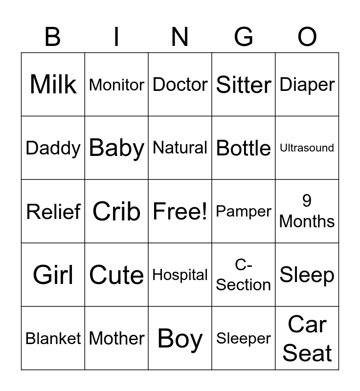 This bingo card has a free space and 25 words: Cute, Boy, Natural, Blanket, Diaper, Milk, Daddy, Monitor, Pamper, Hospital, Bottle, Relief, C-Section, Sleep, Baby, Chair, 9 Months, Doctor, Ultrasound, Crib, Car Seat, Mother, Girl, Sitter and Sleeper.