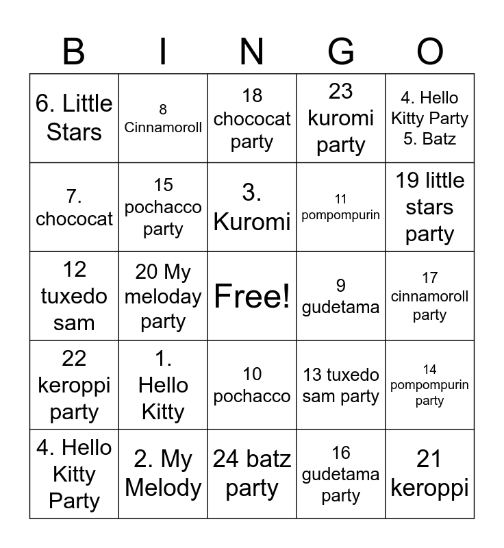 This bingo card has a free space and 24 words: 1. Hello Kitty, 2. My Melody, 3. Kuromi, 4. Hello Kitty Party, 4. Hello Kitty Party 5. Batz, 6. Little Stars, 7. chococat, 8 Cinnamoroll, 9 gudetama, 10 pochacco, 11 pompompurin, 12 tuxedo sam, 13 tuxedo sam party, 14 pompompurin party, 15 pochacco party, 16 gudetama party, 17 cinnamoroll party, 18 chococat party, 19 little stars party, 20 My meloday party, 21 keroppi, 22 keroppi party, 23 kuromi party and 24 batz party.