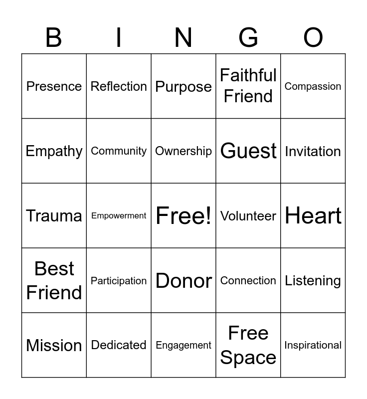 This bingo card has a free space and 25 words: Participation, Engagement, Ownership, Mission, Compassion, Presence, Empathy, Reflection, Volunteer, Donor, Guest, Trauma, Connection, Listening, Community, Awareness, Heart, Purpose, Invitation, Empowerment, Inspirational, Dedicated, Best Friend, Faithful Friend and Free Space.