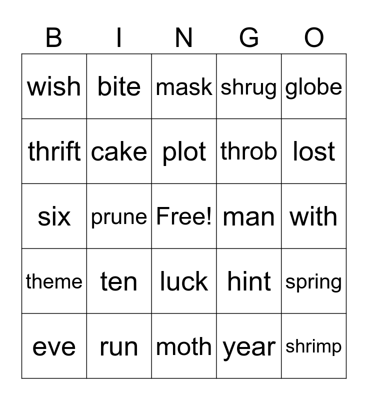 This bingo card has a free space and 33 words: fluke, chase, prune, chose, theme, cake, globe, eve, bite, time, plot, mask, flag, hot, man, lost, run, six, ten, hint, luck, neck, wish, with, moth, shrimp, shrug, throb, thrift, spring, day, year and month.