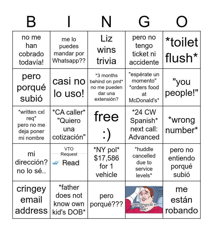This bingo card has 2 images, a free space and 24 words: VTO Request, *father does not know own kid's DOB*, *3 months behind on pmt* no me pueden dar una extensión?, cringey email address, *toilet flush*, no me han cobrado todavía!, pero porqué subió, me lo puedes mandar por Whatsapp??, *24 CW Spanish* next call: Advanced, *NY pol* $17,586 for 1 vehicle, "espérate un momento" *orders food at McDonald's*, *written cxl req* pero no me deja poner mi nombre, *huddle cancelled due to service levels*, pero no entiendo porqué subió, casi no lo uso!, *pending cxl in MA*, *wrong number*, Liz wins trivia, "you people!", *CA caller* "Quiero una cotización", me están robando, mi dirección? no lo sé.., pero no tengo ticket ni accidente and pero porqué???.
