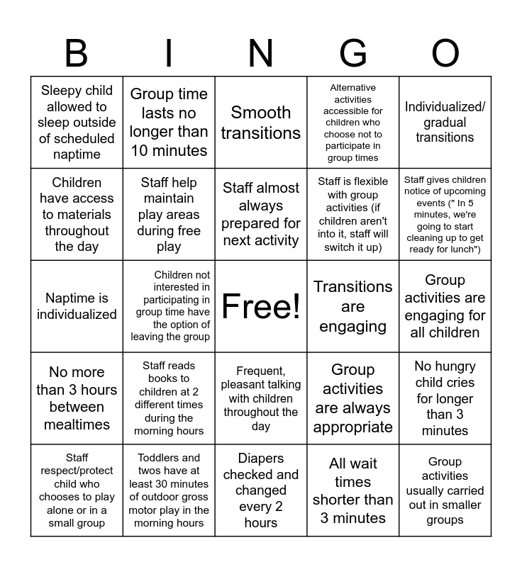 This bingo card has a free space and 24 words: Staff reads books to children at 2 different times during the morning hours, Toddlers and twos have at least 30 minutes of outdoor gross motor play in the morning hours, Staff almost always prepared for next activity, Staff respect/protect child who chooses to play alone or in a small group, Individualized/ gradual transitions, Sleepy child allowed to sleep outside of scheduled naptime, Children have access to materials throughout the day, Group time lasts no longer than 10 minutes, Transitions are engaging, Frequent, pleasant talking with children throughout the day, Staff is flexible with group activities (if children aren't into it, staff will switch it up), Naptime is individualized, Group activities are always appropriate, No hungry child cries for longer than 3 minutes, Staff help maintain play areas during free play, All wait times shorter than 3 minutes, Group activities are engaging for all children, Smooth transitions, Staff gives children notice of upcoming events (" In 5 minutes, we're going to start cleaning up to get ready for lunch"), Children not interested in participating in group time have the option of leaving the group, Group activities usually carried out in smaller groups, No more than 3 hours between mealtimes, Alternative activities accessible for children who choose not to participate in group times and Diapers checked and changed every 2 hours.