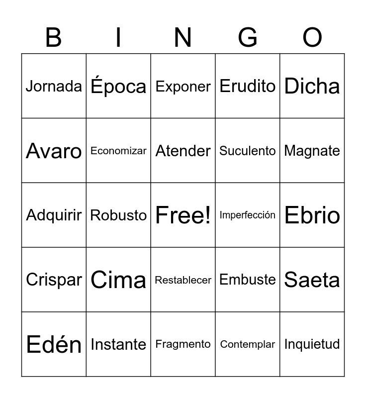 This bingo card has a free space and 24 words: Edén, Cima, Atender, Contemplar, Dicha, Jornada, Época, Exponer, Imperfección, Ebrio, Adquirir, Economizar, Embuste, Saeta, Avaro, Instante, Fragmento, Erudito, Magnate, Crispar, Robusto, Restablecer, Suculento and Inquietud.
