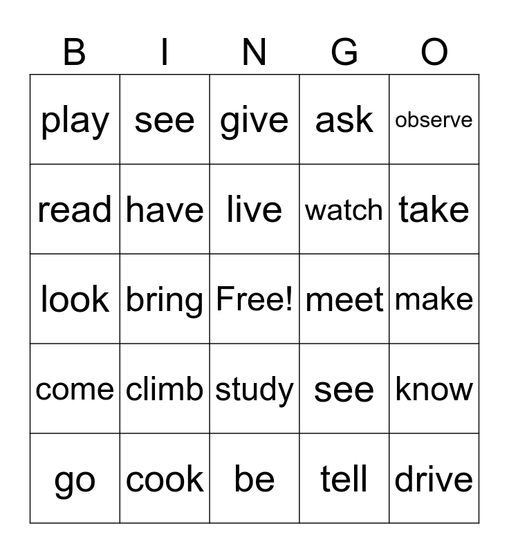 This bingo card has a free space and 24 words: climb, cook, live, go, observe, play, read, see, meet, study, watch, look, see, know, have, tell, make, give, take, bring, drive, come, ask and be.