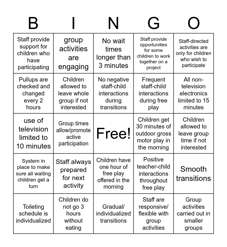 This bingo card has a free space and 24 words: Staff always prepared for next activity, Children do not go 3 hours without eating, No negative staff-child interactions during transitions, Toileting schedule is individualized, Staff-directed activities are only for children who wish to participate, Staff provide support for children who have participating, Pullups are checked and changed every 2 hours, group activities are engaging, Children get 30 minutes of outdoor gross motor play in the morning, Children have one hour of free play offered in the morning, Frequent staff-child interactions during free play, use of television limited to 10 minutes, Positive teacher-child interactions throughout free play, Smooth transitions, Children allowed to leave whole group if not interested, Staff are responsive/ flexible with group activities, Children allowed to leave group time if not interested, No wait times longer than 3 minutes, All non-television electronics limited to 15 minutes, Group times allow/promote active participation, Group activities carried out in smaller groups, System in place to make sure all waiting children get a turn, Staff provide opportunities for some children to work together on a project and Gradual/ individualized transitions.