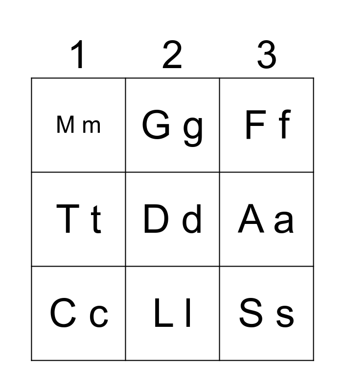 This bingo card has a free space and 8 words: A a, F f, G g, C c, M m, S s, T t and L l.