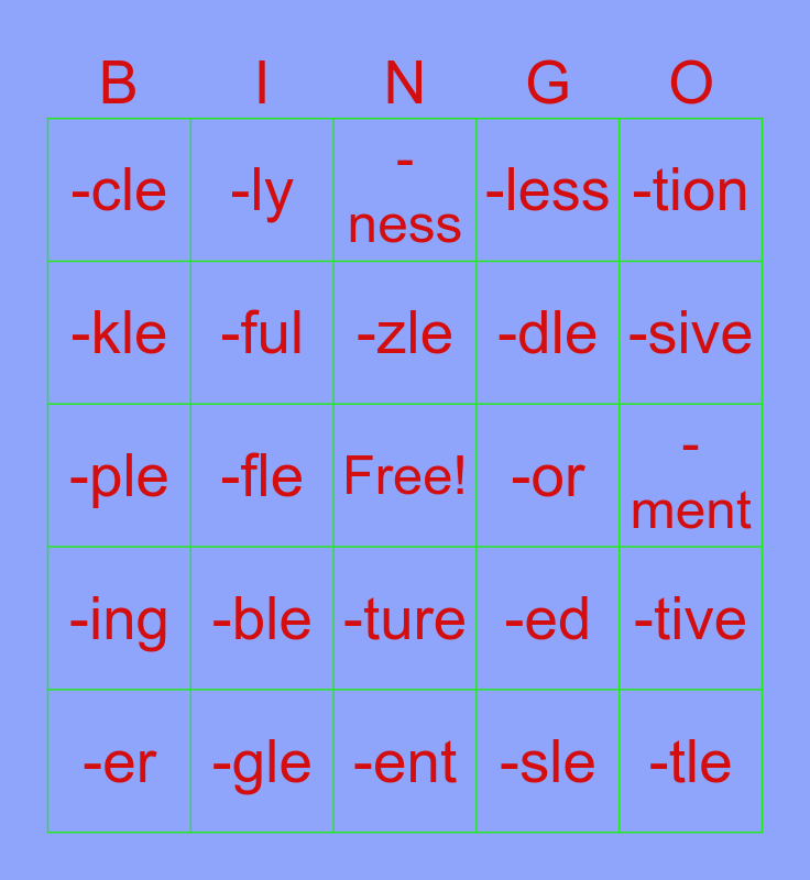 This bingo card has a free space and 24 words: -ble, -gle, -zle, -er, -tion, -cle, -kle, -ly, -or, -ture, -dle, -ple, -ed, -tive, -ful, -sle, -ment, -ness, -sive, -fle, -tle, -ing, -less and -ent.