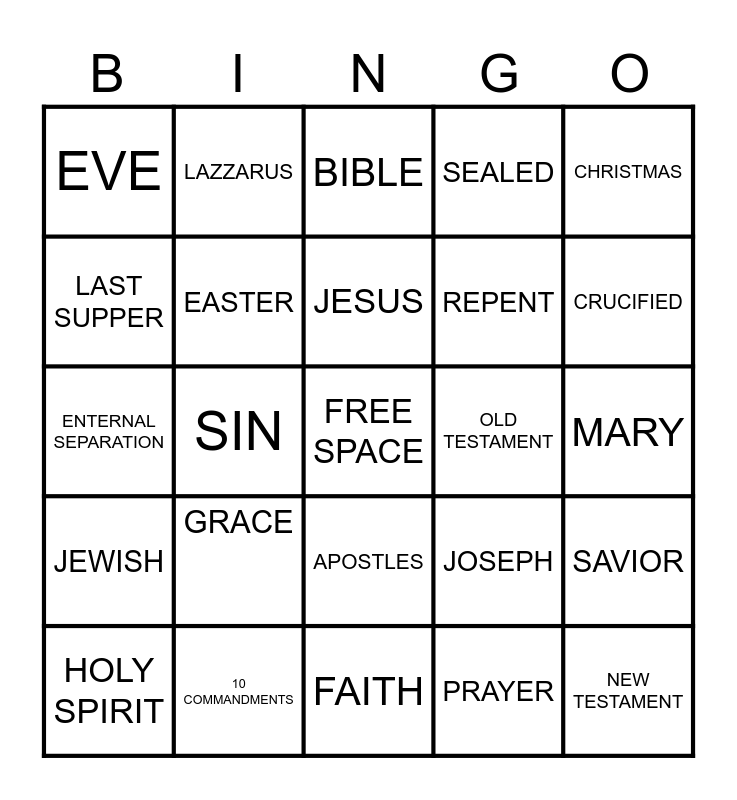 This bingo card has a free space and 24 words: GRACE, 10 COMMANDMENTS, JESUS, HOLY SPIRIT, CHRISTMAS, EVE, LAST SUPPER, LAZZARUS, OLD TESTAMENT, APOSTLES, REPENT, ENTERNAL SEPARATION, JOSEPH, SAVIOR, EASTER, PRAYER, MARY, BIBLE, CRUCIFIED, SIN, NEW TESTAMENT, JEWISH, SEALED and FAITH.