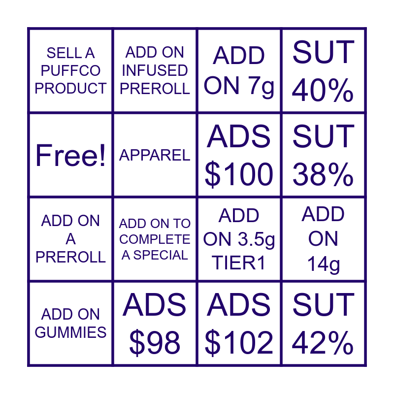 This bingo card has 16 words: ADS $98, ADD ON 14g, ADD ON 7g, SELL A PUFFCO PRODUCT, ADD ON A PREROLL, ADD ON INFUSED PREROLL, ADD ON 3.5g TIER1, ADS $102, Free!, APPAREL, ADD ON GUMMIES, SUT 40%, ADD ON TO COMPLETE A SPECIAL, SUT 38%, ADS $100 and SUT 42%.