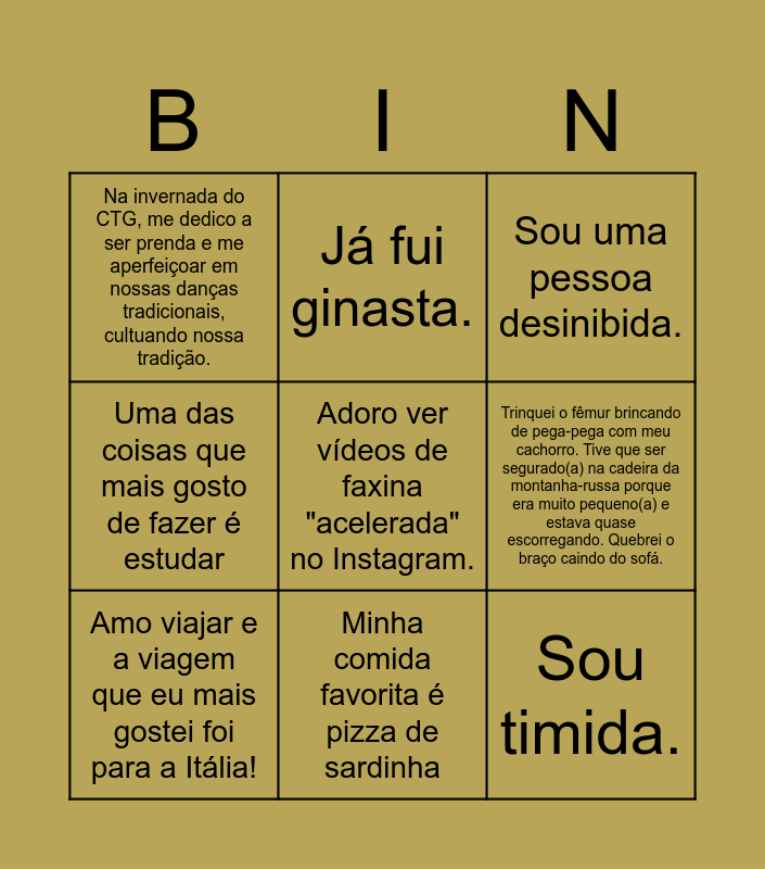 This bingo card has 124 words: Tenho 2 gatos, Sou canhota, Moro em uma casa, Tenho uma irmã gêmea, Faça sempre o seu melhor., Não espere, ponha em prática., Mesmo que pareça difícil, não pare., Acredite que o melhor possa ser feito., Só trabalhando é possível trilhar o caminho., A força está em você., Atreva-se a ser corajoso., Desista, não., Você não precisa de muito para construir um mundo melhor., O futuro é criado por você., A vida é uma grande viagem cheia de altos e baixos., A felicidade de sua vida depende da qualidade dos seus pensamentos., A vida só pode ser compreendida olhando para trás., Cada dia tem seu lugar e sua função., A vida é um livro, e quem fica em casa lê apenas uma página., A normalidade é uma estrada pavimentada, mas não crescem flores nela., Não deixe que o medo de falhar o impeça de viver a vida ao máximo., A inteligência sempre vem das mentes mais ignorantes., O mundo é um livro., O que não é aprendido por experiência, é uma verdade que não se pode afirmar., Eu tenho 1,51 de altura e tenho um filho de 20 anos com 1,80 de altura., Minha comida favorita é pizza de sardinha, Uma das coisas que mais gosto de fazer é estudar, Sou apaixonada por minha família, Adoro ficar em casa, organizar as coisas e assistir um bom filme, Não sou uma boa ouvinte e sim uma boa locutora., Sou carioca, Sou educado, Sou sincero, Eu faço coisas que a maioria das pessoas não sabem como eu faço, eu não sei como eu faço, mas faço! Ex, pintar minha, fazer croche..., Tenho gostos gastronômicos estranhos, tipo comer pão com maionese e goiabada., Amo viajar e a viagem que eu mais gostei foi para a Itália!, Já toquei guitarra na banda da igreja., Já dancei em um restaurante na argentina., Já fui campeã de um torneio de taekwondo., Adoro o calor do sol, minha atividade preferida nos dias de verão é tomar sol na beira da praia., Na invernada do CTG, me dedico a ser prenda e me aperfeiçoar em nossas danças tradicionais, cultuando nossa tradição., Por morar em uma cidade litorânea, acabei adaptando meu paladar e aprecio muito frutos do mar, especialmente peixe cru recém pescado., Chateada porque não estarei no The Town para ver meus Backstreet Boys., Tenho um gato preto chamado Tito., Ano que vem estarei quarentando., Sou uma pessoa desinibida., Adoro escutar músicas., Adoro ver vídeos de faxina "acelerada" no Instagram., Sou café em forma de gente., Adoro filmes de terror., Não consigo ficar um dia sem atividade física., Eu gosto de tomar chimarrão., Já conheci a Neve., Eu não tenho pressa. Tenho urgência em tudo., Já fui em baile funk., Meu 1º amor foi o rei Roberto Carlos., Nunca quebrei nenhum osso., Desmaiei quando fui falar em público pela primeira vez., Fiz programa de Rádio., Já viajei pra seis estados do Brasil., Trinquei o fêmur brincando de pega-pega com meu cachorro. Tive que ser segurado(a) na cadeira da montanha-russa porque era muito pequeno(a) e estava quase escorregando. Quebrei o braço caindo do sofá., Não gosto de musica., Detesto rotina, amo sair viajar., Amo me montar mesmo que seja pra ficar em casa., Sou apaixonada pelo Ricky Martin., Amo pagode, e ja dancei no palco de um evento., Não gosto da Disney., Tenho uma irmã gêmea e sou a mais nova., Sou casada há 2 anos., Sou timida., Ela é muito extrovertida e falante., Ela adora deixar sua casa limpa e organizada., É cheia de manias para limpeza., Eu tenho 1,51 de altura e tenho um filho de 20 anos com 1,80 de altura., Minha comida favorita é pizza de sardinha, Uma das coisas que mais gosto de fazer é estudar, Sou apaixonada por minha família, Adoro ficar em casa, organizar as coisas e assistir um bom filme, Não sou uma boa ouvinte e sim uma boa locutora., Sou carioca, Sou educado, Sou sincero, Eu faço coisas que a maioria das pessoas não sabem como eu faço, eu não sei como eu faço, mas faço! Ex, pintar minha, fazer croche..., Tenho gostos gastronômicos estranhos, tipo comer pão com maionese e goiabada., Amo viajar e a viagem que eu mais gostei foi para a Itália!, Já toquei guitarra na banda da igreja., Já dancei em um restaurante na argentina., Já fui campeã de um torneio de taekwondo., Adoro o calor do sol, minha atividade preferida nos dias de verão é tomar sol na beira da praia., Na invernada do CTG, me dedico a ser prenda e me aperfeiçoar em nossas danças tradicionais, cultuando nossa tradição., Por morar em uma cidade litorânea, acabei adaptando meu paladar e aprecio muito frutos do mar, especialmente peixe cru recém pescado., Chateada porque não estarei no The Town para ver meus Backstreet Boys., Tenho um gato preto chamado Tito., Ano que vem estarei quarentando., Sou uma pessoa desinibida., Adoro escutar músicas., Adoro ver vídeos de faxina "acelerada" no Instagram., Sou café em forma de gente., Adoro filmes de terror., Não consigo ficar um dia sem atividade física., Eu gosto de tomar chimarrão., Já conheci a Neve., Eu não tenho pressa. Tenho urgência em tudo., Já fui em baile funk., Meu 1º amor foi o rei Roberto Carlos., Nunca quebrei nenhum osso., Desmaiei quando fui falar em público pela primeira vez., Fiz programa de Rádio., Já viajei pra seis estados do Brasil., Trinquei o fêmur brincando de pega-pega com meu cachorro. Tive que ser segurado(a) na cadeira da montanha-russa porque era muito pequeno(a) e estava quase escorregando. Quebrei o braço caindo do sofá., Não gosto de musica., Detesto rotina, amo sair viajar., Amo me montar mesmo que seja pra ficar em casa., Sou apaixonada pelo Ricky Martin., Amo pagode, e ja dancei no palco de um evento., Não gosto da Disney., Tenho uma irmã gêmea e sou a mais nova., Sou casada há 2 anos., Sou timida., Ela é muito extrovertida e falante. Ela adora deixar sua casa limpa e organizada., É cheia de manias para limpeza., Nasci em outro país., Já fui ginasta. and Tenho uma tatuagem..