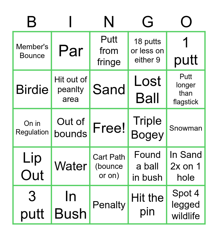 This bingo card has a free space and 24 words: Water, In Bush, Sand, 3 putt, 1 putt, Member's Bounce, Birdie, Par, Triple Bogey, Cart Path (bounce or on), Lost Ball, On in Regulation, Found a ball in bush, In Sand 2x on 1 hole, Hit out of peanlty area, Hit the pin, Snowman, Putt from fringe, Putt longer than flagstick, Out of bounds, Spot 4 legged wildlife, Lip Out, 18 putts or less on either 9 and Penalty.