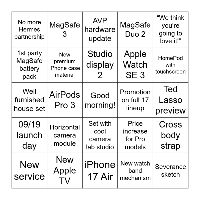 This bingo card has a free space and 30 words: New Apple TV, AirTag 2, AirPods Pro 3, Pink 17 Pro, No more Hermes partnership, AVP hardware update, New premium iPhone case material, Set with cool camera lab studio, Promotion on full 17 lineup, iPhone 17 Air, Ted Lasso preview, Severance sketch, New watch band mechanism, HomePod mini 2, HomePod with touchscreen, Increase to base iCloud storage, Price increase for Pro models, 09/19 launch day, Horizontal camera module, “We think you’re going to love it!”, Well furnished house set, Celebrity appearance, MagSafe 3, Apple Watch SE 3, 1st party MagSafe battery pack, MagSafe Duo 2, Cross body strap, New service, Studio display 2 and Additional sensors on series 11 watch.