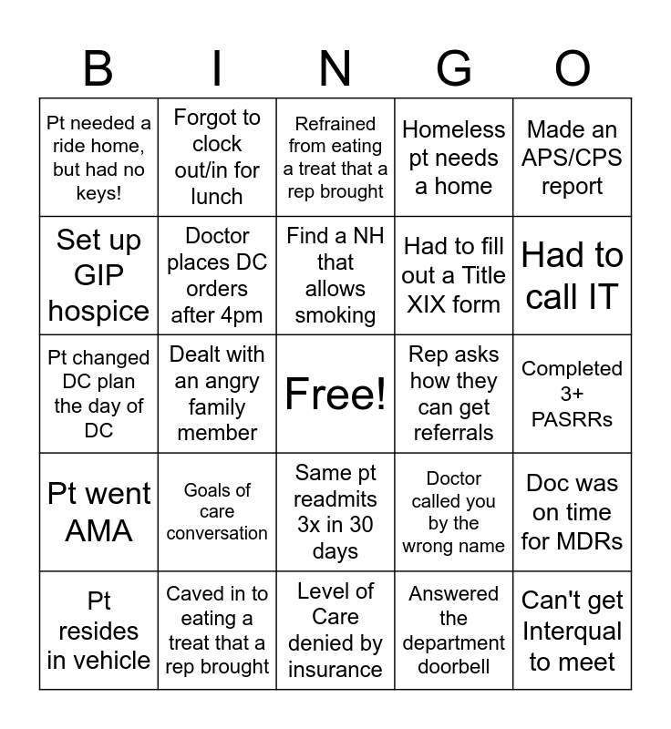 This bingo card has a free space and 39 words: Arranged unfunded dialysis chair, NH refused their own resident, Pt appeal their DC at 5pm, Doctor places DC orders after 4pm, Pt resides in vehicle, Same pt readmits 3x in 30 days, Find a NH that allows smoking, Got fired by a patient, Made an APS/CPS report, Pt went AMA, Dealt with an angry family member, Homeless pt needs a home, Can't get Interqual to meet, Completed 3+ PASRRs, Rep asks how they can get referrals, Goals of care conversation, HH/ Infusion/ Wound Vac Trifecta, Pt needed a ride home, but had no keys!, Pt called you a "doctor", Doctor called you by the wrong name, Set up GIP hospice, Level of Care denied by insurance, Had to fill out a Title XIX form, Had to call IT, Pt says "no one told me that.", Completed a Healthstream, Qualified for OBS, but is inpatient, Pt asks you to help them get to the bathroom, Demographics say insured, but pt is unfunded, Forgot to clock out/in for lunch, Had 3 SNF choices decline, Had a pt thank you for your help, Refrained from eating a treat that a rep brought, Caved in to eating a treat that a rep brought, Answered the department doorbell, All nurses were present & on time for MDRs, Doc was on time for MDRs, Pt changed DC plan the day of DC and Nurse said no one answered when trying to call report to SNF.