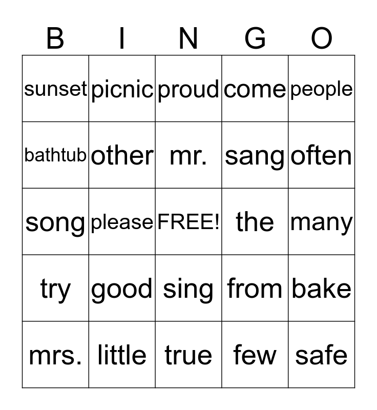 This bingo card has a free space and 24 words: good, little, mr., mrs., people, sunset, bathtub, picnic, the, sing, sang, song, from, bake, other, few, many, proud, often, please, safe, try, come and true.