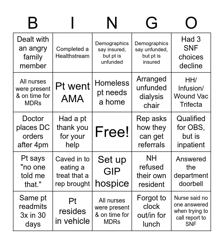 This bingo card has a free space and 37 words: Level of Care denied by insurance, Pt changed DC plan the day of DC, Pt needed a ride home, but had no keys!, Pt went AMA, Answered the department doorbell, Caved in to eating a treat that a rep brought, Homeless pt needs a home, Pt called you a "doctor", Had 3 SNF choices decline, Pt asks you to help them get to the bathroom, Had a pt thank you for your help, Demographics say unfunded, but pt is insured, Nurse said no one answered when trying to call report to SNF, Qualified for OBS, but is inpatient, All nurses were present & on time for MDRs, Pt says "no one told me that.", Doc was on time for MDRs, Demographics say insured, but pt is unfunded, Set up GIP hospice, Rep asks how they can get referrals, Dealt with an angry family member, HH/ Infusion/ Wound Vac Trifecta, Same pt readmits 3x in 30 days, All nurses were present & on time for MDRs, Refrained from eating a treat that a rep brought, Forgot to clock out/in for lunch, Completed a Healthstream, Made an APS/CPS report, Got fired by a patient, Find a NH that allows smoking, Had to call IT, Pt resides in vehicle, Doctor places DC orders after 4pm, Can't get Interqual to meet, NH refused their own resident, Arranged unfunded dialysis chair and Goals of care conversation.
