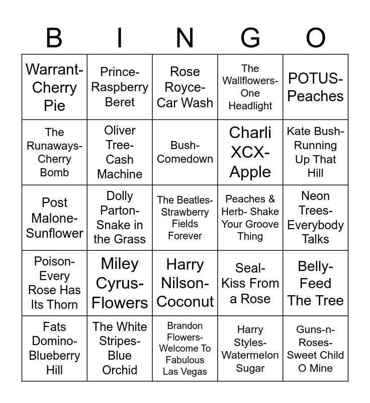 This bingo card has 25 words: Miley Cyrus- Flowers, Brandon Flowers- Welcome To Fabulous Las Vegas, Bush- Comedown, Fats Domino- Blueberry Hill, POTUS- Peaches, Warrant- Cherry Pie, The Runaways- Cherry Bomb, Prince- Raspberry Beret, Peaches & Herb- Shake Your Groove Thing, Harry Nilson- Coconut, Charli XCX- Apple, Post Malone- Sunflower, Seal- Kiss From a Rose, Belly- Feed The Tree, Oliver Tree- Cash Machine, Guns-n-Roses- Sweet Child O Mine, Neon Trees- Everybody Talks, Rose Royce- Car Wash, Kate Bush- Running Up That Hill, Dolly Parton- Snake in the Grass, The Beatles- Strawberry Fields Forever, The White Stripes- Blue Orchid, Poison- Every Rose Has Its Thorn, The Wallflowers- One Headlight and Harry Styles- Watermelon Sugar.