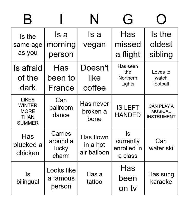 This bingo card has a free space and 24 words: Is bilingual, Carries around a lucky charm, Doesn't like coffee, Has been on tv, Is the oldest sibling, Is the same age as you, Is a morning person, Is a vegan, IS LEFT HANDED, CAN PLAY A MUSICAL INSTRUMENT, LIKES WINTER MORE THAN SUMMER, Has been to France, Is currently enrolled in a class, Can water ski, Is afraid of the dark, Looks like a famous person, Has a tattoo, Has missed a flight, Loves to watch football, Has plucked a chicken, Can ballroom dance, Has flown in a hot air balloon, Has seen the Northern Lights and Has sung karaoke.