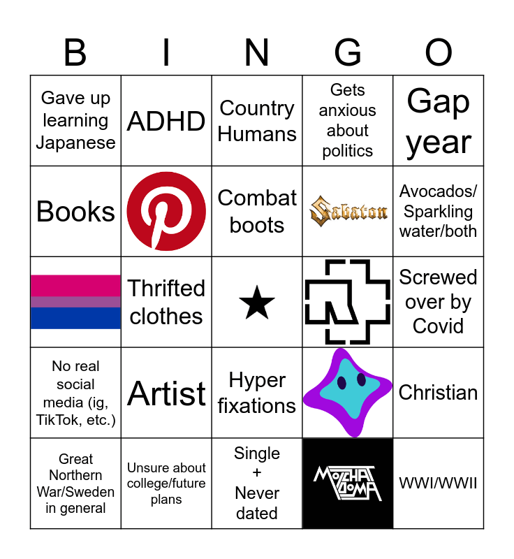 This bingo card has 6 images, a free space and 18 words: Artist, Unsure about college/future plans, Combat boots, Great Northern War/Sweden in general, Gap year, Gave up learning Japanese, Books, ADHD, Hyper fixations, Christian, Screwed over by Covid, Country Humans, Avocados/ Sparkling water/both, Thrifted clothes, WWI/WWII, No real social media (ig, TikTok, etc.), Gets anxious about politics and Single + Never dated.