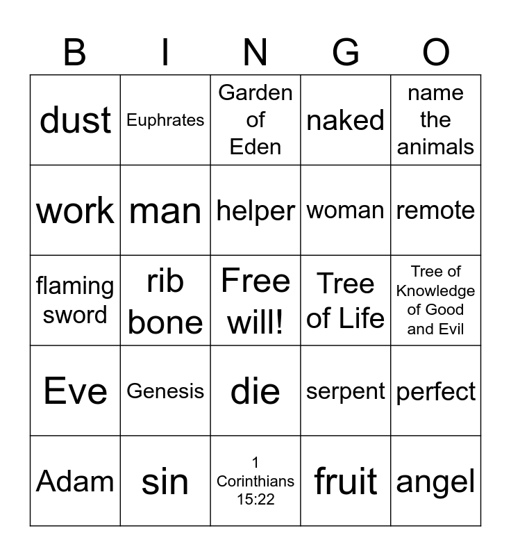 This bingo card has a free space and 29 words: Adam, do not eat, rib bone, ran & hid, dust, Garden of Eden, man, Genesis, Tree of Life, sin, Tree of Knowledge of Good and Evil, angel, 1 Corinthians 15:22, fruit, remote, breath of life, die, Eve, name the animals, flaming sword, serpent, pain, woman, work, naked, Euphrates, perfect, helper and knowledge of good and evil.