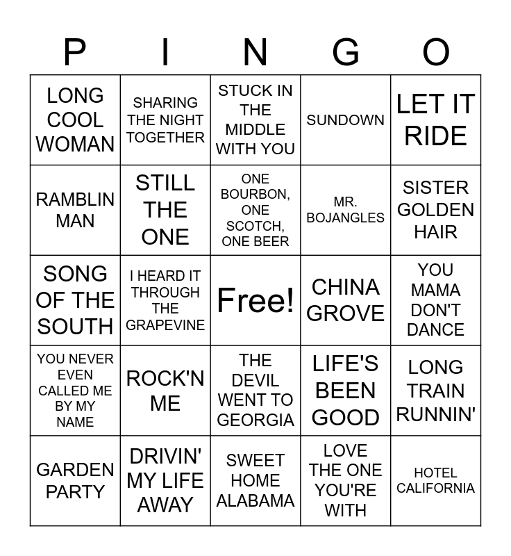 This bingo card has a free space and 49 words: HAVE YOU EVER SEEN THE RAIN, HOTEL CALIFORNIA, LISTEN TO THE MUSIC, SWEET HOME ALABAMA, ROCK'N ME, GOOD HEARTED WOMAN, SHARING THE NIGHT TOGETHER, THANK GOD I'M A COUNTRY BOY, RAMBLIN MAN, UP AROUND THE BEND, STILL THE ONE, SUNDOWN, LONG TRAIN RUNNIN', LIFE'S BEEN GOOD, I CAN'T TELL YOU WHY, I'LL HAVE TO SAT I LOVE YOU IN A SONG, ONE BOURBON, ONE SCOTCH, ONE BEER, CHINA GROVE, WILD NIGHT, LET IT RIDE, I HEARD IT THROUGH THE GRAPEVINE, LOVE THE ONE YOU'RE WITH, LONG COOL WOMAN, MR. BOJANGLES, TEACH YOUR CHILDREN, SISTER GOLDEN HAIR, GARDEN PARTY, RUNNING ON EMPTY, THE DEVIL WENT TO GEORGIA, YOU NEVER EVEN CALLED ME BY MY NAME, DON'T IT MAKE MY BROWN EYES BLUE, LEADER OF THE BAND, HEARD OF GOLD, COPPERHEAD ROAD, DRIVIN' MY LIFE AWAY, REELIN' IN THE YEARS, STILL THE SAME, THE CHAIR, YOU MAMA DON'T DANCE, IT'S A HEARTACHE, LAY DOWN SALLY, DOCTOR MY EYES, HERE COMES MY GIRL, LA GRANGE, SONG OF THE SOUTH, STUCK IN THE MIDDLE WITH YOU, LOLA, BLINDED BY THE LIGHT and SPIRIT IN THE SKY.