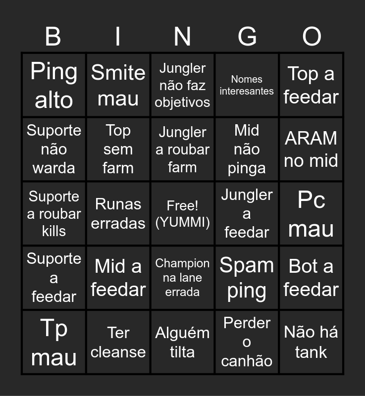 This bingo card has a free space and 24 words: Mid a feedar, Ter cleanse, Jungler a roubar farm, Tp mau, Top a feedar, Ping alto, Suporte não warda, Smite mau, Jungler a feedar, Champion na lane errada, Mid não pinga, Suporte a roubar kills, Spam ping, Bot a feedar, Top sem farm, Perder o canhão, Pc mau, Jungler não faz objetivos, ARAM no mid, Runas erradas, Não há tank, Suporte a feedar, Nomes interesantes and Alguém tilta.