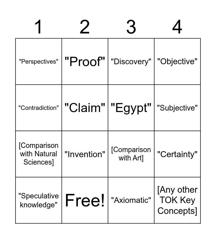 This bingo card has 20 words: "Certainty", "Gödel", "Discovery", "Utility", "Speculative knowledge", "Contradiction", Free!, "Perspectives", [Comparison with Natural Sciences], "Proof", "Invention", [Comparison with Art], "Claim", [Any other TOK Key Concepts], "Egypt", "Conjecture", "Subjective", "Objective", "Axiomatic" and "Propaganda".