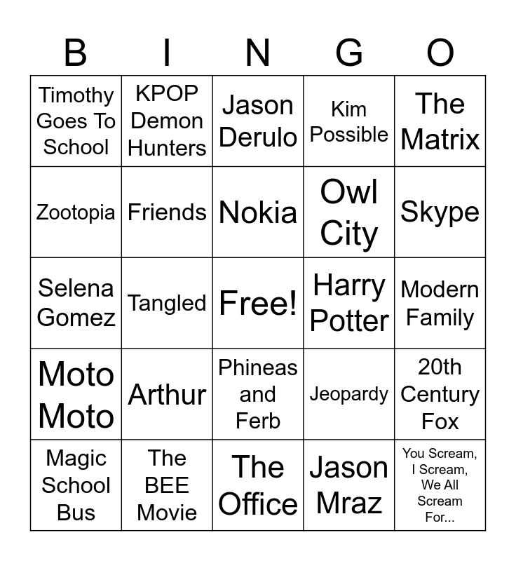 This bingo card has a free space and 25 words: Arthur, The Office, Nokia, Magic School Bus, The Matrix, Timothy Goes To School, Zootopia, KPOP Demon Hunters, Harry Potter, Phineas and Ferb, Owl City, Selena Gomez, Jeopardy, 20th Century Fox, Friends, Mario, Modern Family, Jason Derulo, Skype, Tangled, You Scream, I Scream, We All Scream For..., The BEE Movie, Moto Moto, Kim Possible and Jason Mraz.