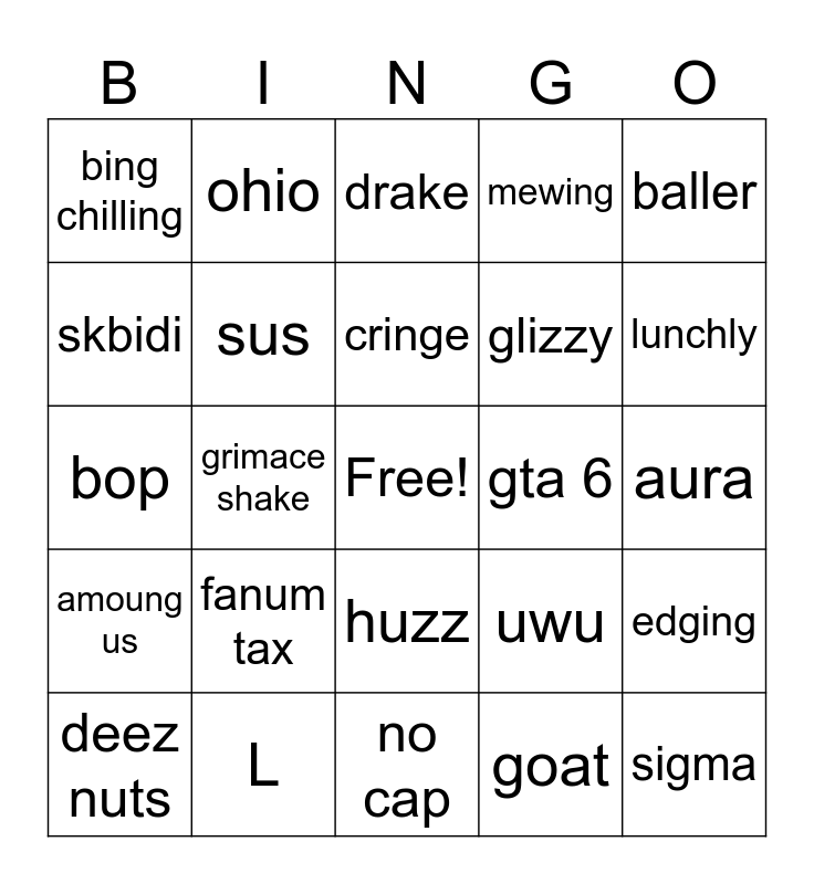 This bingo card has a free space and 49 words: gyatt, sigma, rizz, no cap, fanum tax, lankybox, ohio, beta, skbidi, 6 7, sus, mewing, edging, uwu, baddie, bussin', cringe, gta 6, glazing, baller, grimace shake, goat, bing chilling, glizzy, sturdy, lunchly, deez nuts, gooning, huzz, amoung us, tuun tuun sahar, sprunki, alpha, looks maxing, L, ratio, goofy ahh, delulu, aura, baka, kai cenat, lil' bro, tiktok rizz party, livvy dune, bop, drake, dih, brainrot and 💀.