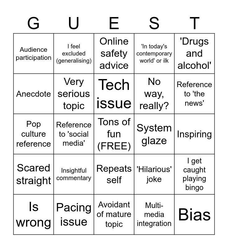 This bingo card has a free space and 24 words: Insightful commentary, Pacing issue, Tech issue, Is wrong, 'Drugs and alcohol', Audience participation, Anecdote, I feel excluded (generalising), System glaze, Repeats self, No way, really?, Pop culture reference, 'Hilarious' joke, I get caught playing bingo, Very serious topic, Multi-media integration, Inspiring, Online safety advice, Reference to 'the news', Reference to 'social media', Bias, Scared straight, 'In today's contemporary world' or ilk and Avoidant of mature topic.