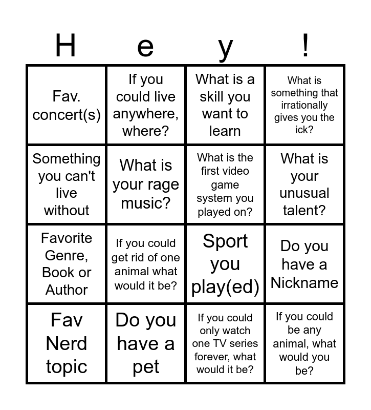 This bingo card has 16 words: Do you have a pet, Do you have a Nickname, What is a skill you want to learn, Fav. concert(s), Favorite Genre, Book or Author, If you could live anywhere, where?, Sport you play(ed), If you could only watch one TV series forever, what would it be?, Something you can't live without, What is your rage music?, Fav Nerd topic, What is something that irrationally gives you the ick?, If you could get rid of one animal what would it be?, What is your unusual talent?, What is the first video game system you played on? and If you could be any animal, what would you be?.