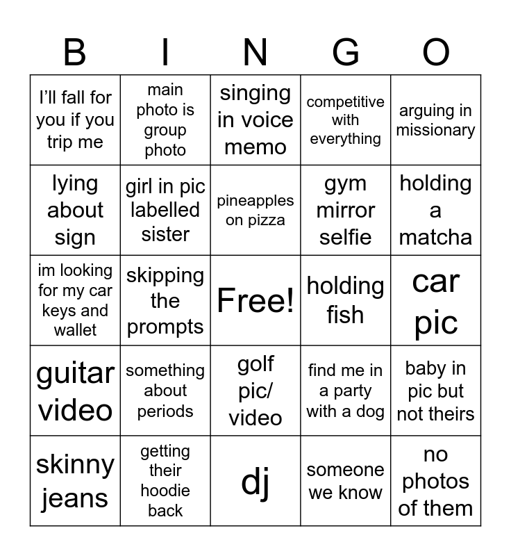 This bingo card has a free space and 24 words: something about periods, getting their hoodie back, pineapples on pizza, skinny jeans, arguing in missionary, I’ll fall for you if you trip me, lying about sign, main photo is group photo, holding fish, golf pic/ video, gym mirror selfie, im looking for my car keys and wallet, find me in a party with a dog, baby in pic but not theirs, girl in pic labelled sister, someone we know, car pic, singing in voice memo, holding a matcha, skipping the prompts, no photos of them, guitar video, competitive with everything and dj.