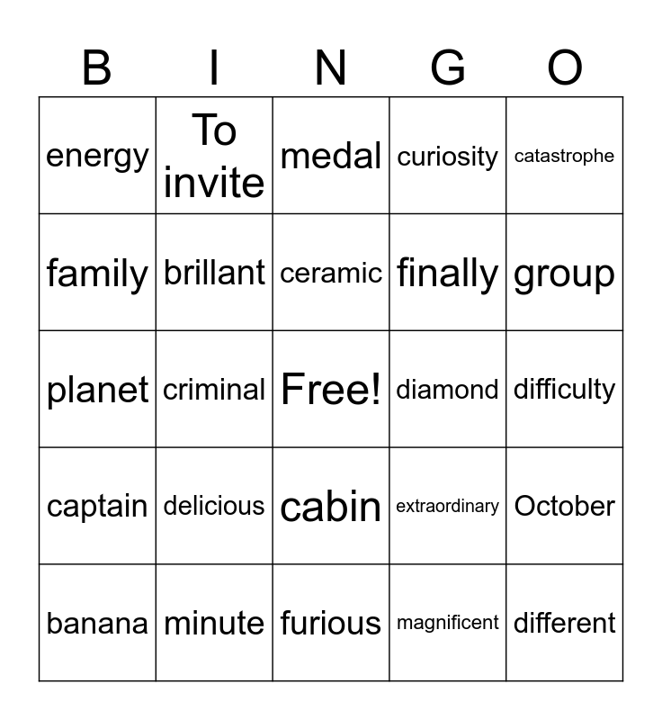 This bingo card has a free space and 39 words: automatic, artistic, bike, brillant, banana, cabin, ceramic, ceremony, catastrophe, captain, criminal, curiosity, different, difficulty, diamond, delicious, doctor, energy, exotic, extraordinary, family, furious, finally, group, giraffe, history, human, hospital, interesting, To invite, lion, moment, medal, minute, magnificent, ordinary, October, planet and rich.