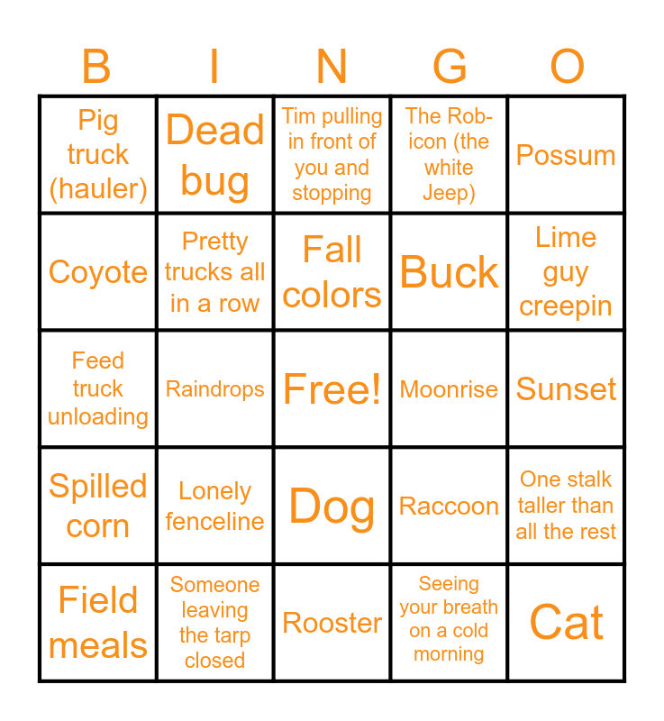 This bingo card has a free space and 27 words: Raccoon, Cab corn, Buck, Rooster, Coyote, Tim pulling in front of you and stopping, Dead bug, Spilled corn, Moonrise, One stalk taller than all the rest, Feed truck unloading, The Rob-icon (the white Jeep), Field meals, Someone leaving the tarp closed, Lime guy creepin, Sinclair guy, Pretty trucks all in a row, Fall colors, Lonely fenceline, Pig truck (hauler), Sunset, Seeing your breath on a cold morning, Raindrops, Cat, Dog, Possum and Row of Shame.