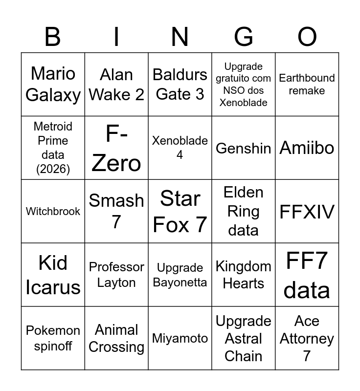 This bingo card has 25 words: Kid Icarus, Animal Crossing, Star Fox 7, Upgrade Astral Chain, Earthbound remake, Mario Galaxy, Alan Wake 2, Baldurs Gate 3, Elden Ring data, FF7 data, Metroid Prime data (2026), F-Zero, Miyamoto, Kingdom Hearts, Amiibo, Pokemon spinoff, Smash 7, Xenoblade 4, Genshin, FFXIV, Witchbrook, Professor Layton, Upgrade Bayonetta, Upgrade gratuito com NSO dos Xenoblade and Ace Attorney 7.