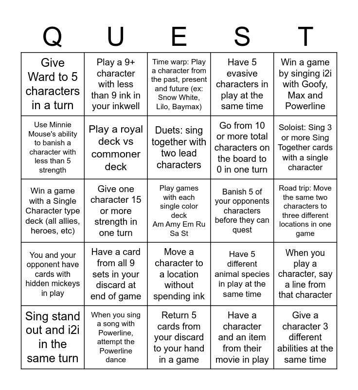 This bingo card has a free space and 24 words: Have a card from all 9 sets in your discard at end of game, When you sing a song with Powerline, attempt the Powerline dance, Duets: sing together with two lead characters, Sing stand out and i2i in the same turn, Win a game by singing i2i with Goofy, Max and Powerline, Give Ward to 5 characters in a turn, Use Minnie Mouse's ability to banish a character with less than 5 strength, Play a 9+ character with less than 9 ink in your inkwell, Banish 5 of your opponents characters before they can quest, Move a character to a location without spending ink, Go from 10 or more total characters on the board to 0 in one turn, Win a game with a Single Character type deck (all allies, heroes, etc), Have 5 different animal species in play at the same time, When you play a character, say a line from that character, Play a royal deck vs commoner deck, Have a character and an item from their movie in play, Road trip: Move the same two characters to three different locations in one game, Time warp: Play a character from the past, present and future (ex: Snow White, Lilo, Baymax), Soloist: Sing 3 or more Sing Together cards with a single character, Give one character 15 or more strength in one turn, Give a character 3 different abilities at the same time, You and your opponent have cards with hidden mickeys in play, Have 5 evasive characters in play at the same time and Return 5 cards from your discard to your hand in a game.