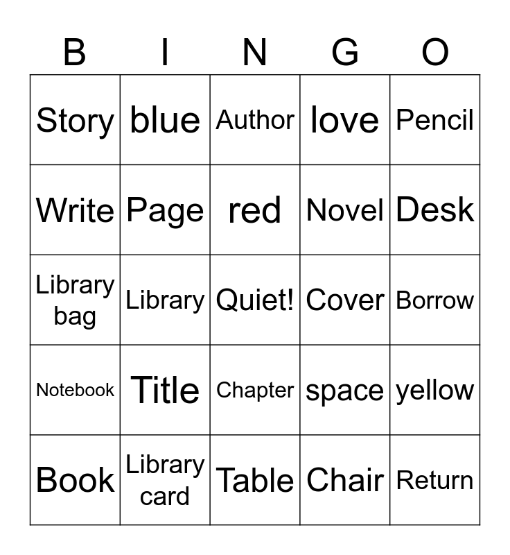 This bingo card has a free space and 29 words: Book, Read, Library, Shelf, Story, Author, Page, Title, Cover, Library card, Borrow, Return, Table, Chair, Desk, Picture, Chapter, Notebook, Pencil, Library bag, space, Grow, Novel, Write, love, blue, yellow, red and history.