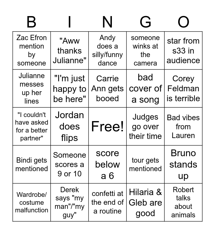This bingo card has a free space and 24 words: Someone scores a 9 or 10, Derek says "my man"/"my guy", Carrie Ann gets booed, Wardrobe/ costume malfunction, star from s33 in audience, Zac Efron mention by someone, Julianne messes up her lines, "Aww thanks Julianne", Judges go over their time, score below a 6, bad cover of a song, "I couldn't have asked for a better partner", tour gets mentioned, Bruno stands up, "I'm just happy to be here", Hilaria & Gleb are good, Bad vibes from Lauren, Andy does a silly/funny dance, Corey Feldman is terrible, Jordan does flips, Robert talks about animals, Bindi gets mentioned, someone winks at the camera and confetti at the end of a routine.