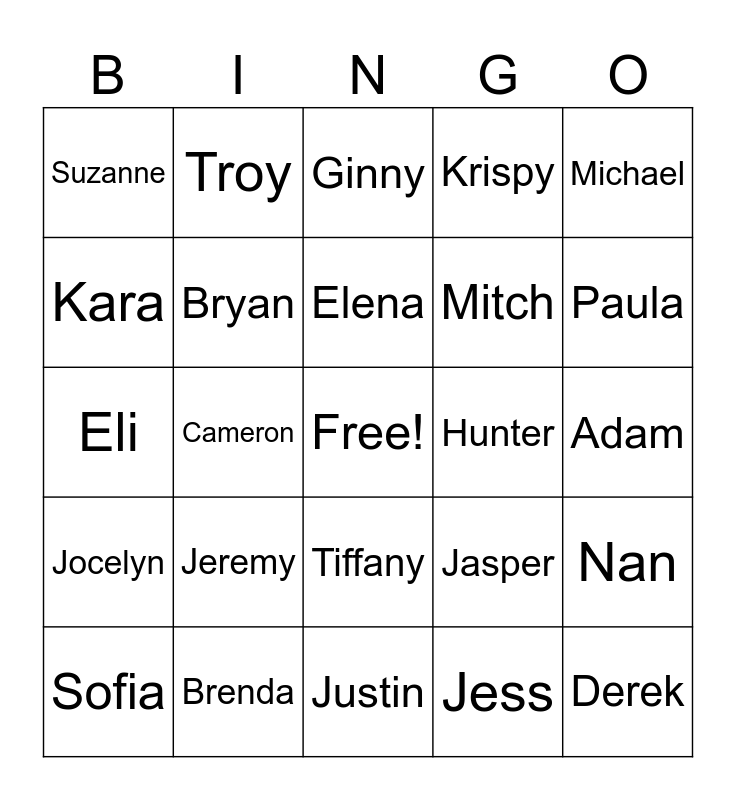 This bingo card has a free space and 24 words: Jeremy, Brenda, Elena, Sofia, Michael, Suzanne, Kara, Troy, Hunter, Tiffany, Mitch, Eli, Jasper, Nan, Bryan, Jess, Adam, Ginny, Paula, Cameron, Derek, Jocelyn, Krispy and Justin.