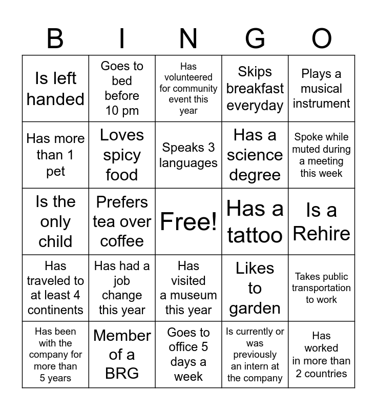 This bingo card has a free space and 24 words: Has had a job change this year, Member of a BRG, Speaks 3 languages, Has been with the company for more than 5 years, Plays a musical instrument, Is left handed, Has more than 1 pet, Goes to bed before 10 pm, Has a tattoo, Has visited a museum this year, Has a science degree, Is the only child, Likes to garden, Takes public transportation to work, Loves spicy food, Is currently or was previously an intern at the company, Is a Rehire, Has volunteered for community event this year, Spoke while muted during a meeting this week, Prefers tea over coffee, Has worked in more than 2 countries, Has traveled to at least 4 continents, Skips breakfast everyday and Goes to office 5 days a week.