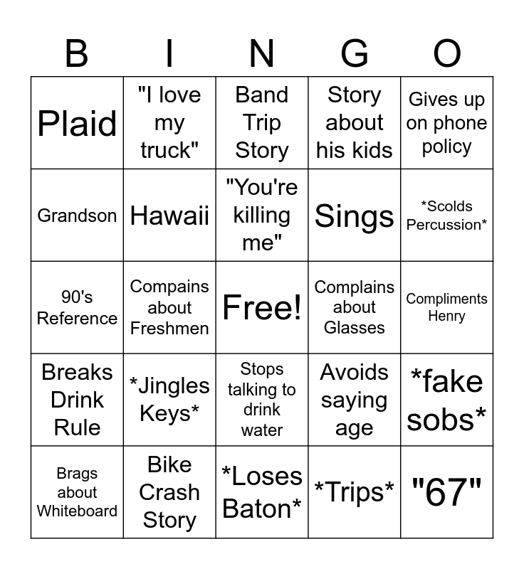 This bingo card has a free space and 29 words: Brags about Whiteboard, Brags about Bandroom, Compains about Freshmen, "Suck Less Every Day", Plaid, Band Trip Story, Hawaii, *Jingles Keys*, Complains about Glasses, Bike Crash Story, Compliments Henry, "67", *Loses Baton*, *Trips*, *Scolds Percussion*, Brags about Auditorium, Stops talking to drink water, Breaks Drink Rule, Gives up on phone policy, 90's Reference, Avoids saying age, Dances, Sings, Grandson, Story about his kids, "I love my truck", *fake sobs*, "You're killing me" and *Gives up and ends band early*.