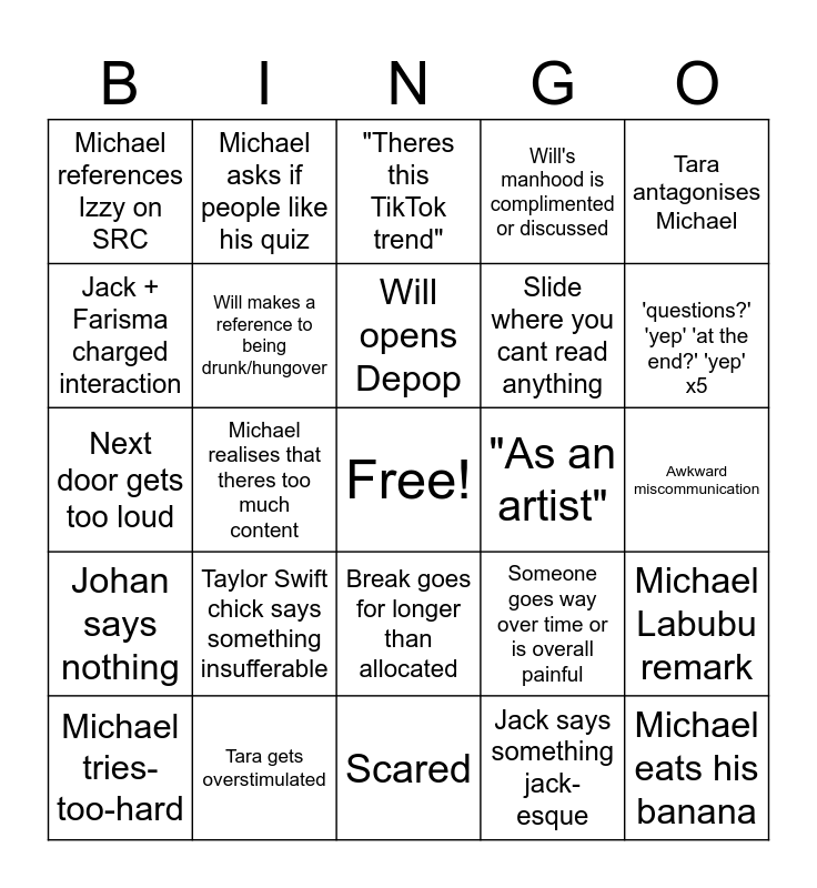 This bingo card has a free space and 24 words: Taylor Swift chick says something insufferable, Tara gets overstimulated, Will opens Depop, Michael tries-too-hard, Tara antagonises Michael, Michael references Izzy on SRC, Jack + Farisma charged interaction, Michael asks if people like his quiz, "As an artist", Break goes for longer than allocated, Slide where you cant read anything, Next door gets too loud, Someone goes way over time or is overall painful, Michael Labubu remark, Will makes a reference to being drunk/hungover, Jack says something jack-esque, Awkward miscommunication, "Theres this TikTok trend", 'questions?' 'yep' 'at the end?' 'yep' x5, Michael realises that theres too much content, Michael eats his banana, Johan says nothing, Will's manhood is complimented or discussed and Scared.
