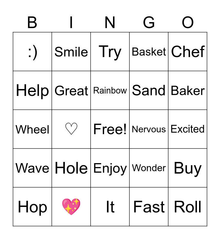 This bingo card has a free space and 30 words: 💖, ☆, ♡, Hi, :), Try, Great, Enjoy, Nervous, It, Excited, Roll, Fast, Store, Baker, Farm, Wonder, Wave, Hole, Chef, Wheel, Build, Smile, Sand, Help, Basket, Buy, Hop, Rainbow and Frog.