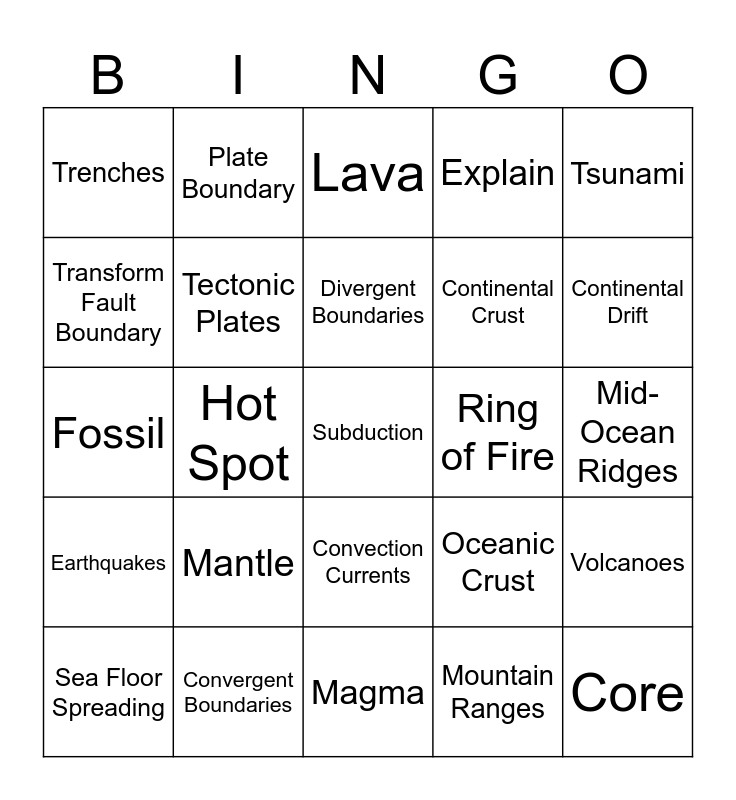 This bingo card has a free space and 24 words: Mantle, Convergent Boundaries, Divergent Boundaries, Sea Floor Spreading, Tsunami, Trenches, Transform Fault Boundary, Plate Boundary, Ring of Fire, Convection Currents, Continental Crust, Fossil, Oceanic Crust, Volcanoes, Tectonic Plates, Mountain Ranges, Mid-Ocean Ridges, Lava, Continental Drift, Hot Spot, Core, Earthquakes, Explain and Magma.