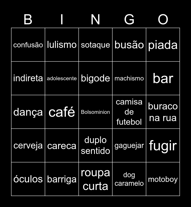 This bingo card has a free space and 24 words: careca, barriga, bigode, óculos, piada, confusão, indireta, lulismo, camisa de futebol, duplo sentido, machismo, dança, gaguejar, fugir, adolescente, dog caramelo, buraco na rua, sotaque, bar, café, motoboy, cerveja, busão and roupa curta.