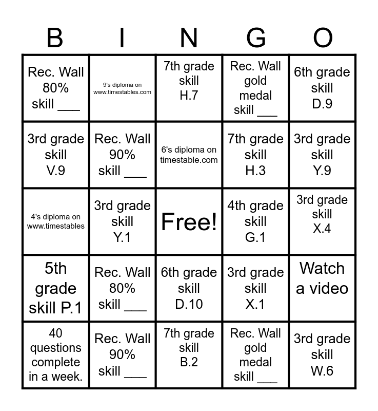 This bingo card has a free space and 24 words: Rec. Wall 80% skill ___, Rec. Wall 90% skill ___, 6's diploma on timestable.com, 40 questions complete in a week., 6th grade skill D.9, Rec. Wall 80% skill ___, 3rd grade skill V.9, 9's diploma on www.timestables.com, 4th grade skill G.1, 6th grade skill D.10, 7th grade skill H.3, 4's diploma on www.timestables, 3rd grade skill X.1, Watch a video, Rec. Wall 90% skill ___, Rec. Wall gold medal skill ___, 3rd grade skill X.4, 7th grade skill H.7, 3rd grade skill Y.9, 3rd grade skill Y.1, 3rd grade skill W.6, 5th grade skill P.1, Rec. Wall gold medal skill ___ and 7th grade skill B.2.