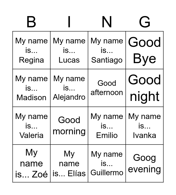 This bingo card has 16 words: My name is... Elías, My name is... Ivanka, My name is... Santiago, My name is... Regina, My name is... Valeria, My name is... Lucas, My name is... Emilio, My name is... Guillermo, My name is... Madison, My name is... Alejandro, My name is... Zoé, Good Bye, Good morning, Good night, Good afternoon and Goog evening.