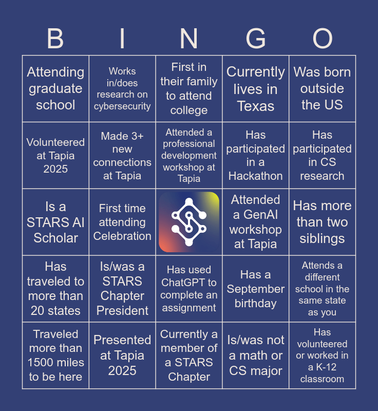This bingo card has a free space and 24 words: Is/was a STARS Chapter President, Presented at Tapia 2025, Attended a professional development workshop at Tapia, Traveled more than 1500 miles to be here, Was born outside the US, Attending graduate school, Volunteered at Tapia 2025, Works in/does research on cybersecurity, Attended a GenAI workshop at Tapia, Has used ChatGPT to complete an assignment, Has participated in a Hackathon, Is a STARS AI Scholar, Has a September birthday, Attends a different school in the same state as you, Made 3+ new connections at Tapia, Is/was not a math or CS major, Has more than two siblings, First in their family to attend college, Has participated in CS research, First time attending Celebration, Has volunteered or worked in a K-12 classroom, Has traveled to more than 20 states, Currently lives in Texas and Currently a member of a STARS Chapter.